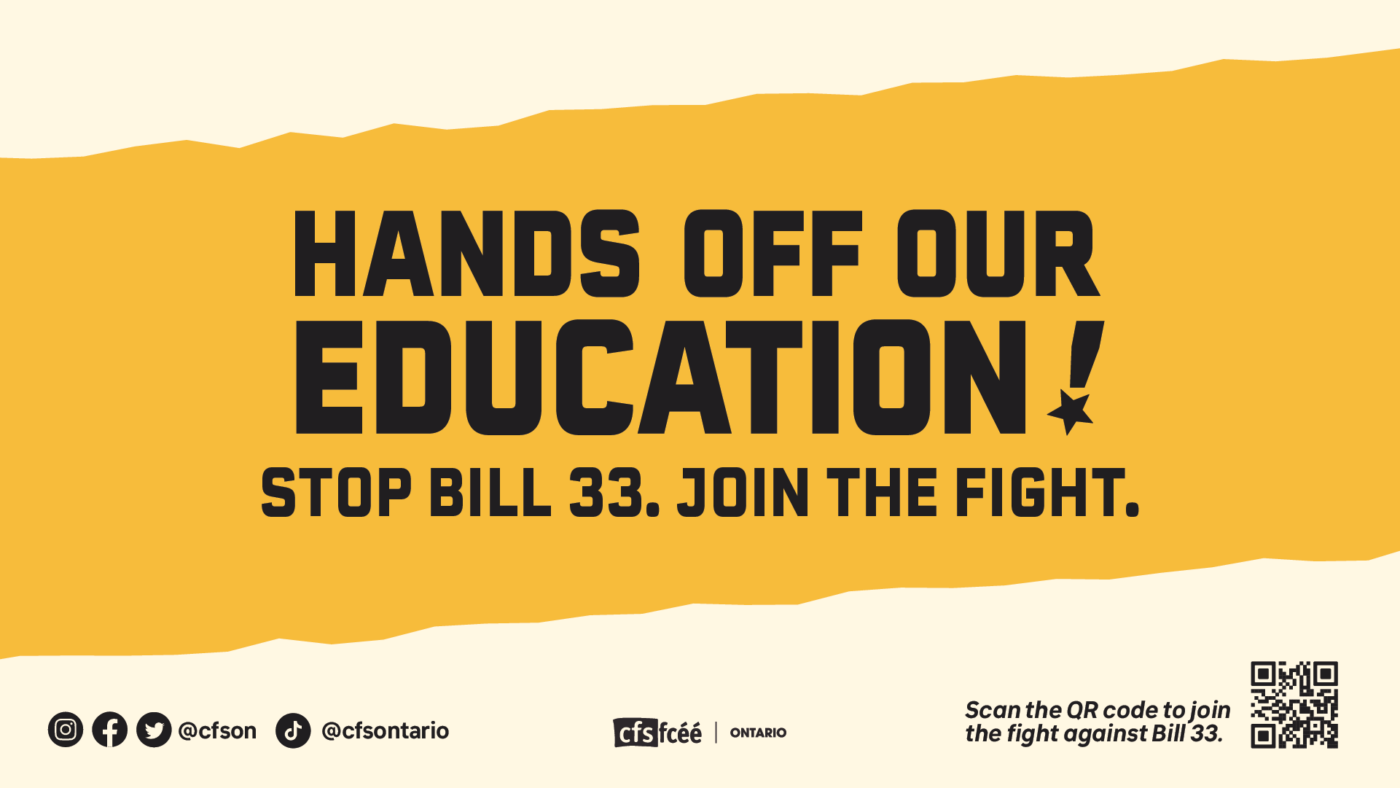 Hands Off Our Education! is a provincial campaign launched by the Canadian Federation of Students-Ontario, aimed at opposing the persistent and targeted attacks on education. Since the Ford government came into power, there have been a number of debilitating attacks on education in the province – the two most recent ones being the introduction of Bill 33 (May 2025) and the recent OSAP & Tuition Announcement (February 2026).