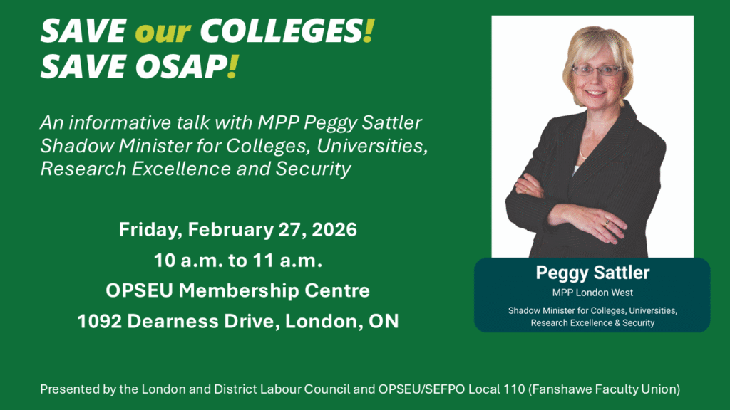 Join MPP Peggy Sattler (Shadow Minister for Colleges, Universities, Research Excellence and Security) for an informative talk detailing the Ford Government’s under-funding of Ontario’s public colleges and the impact to students, faculty and support staff, and our communities.